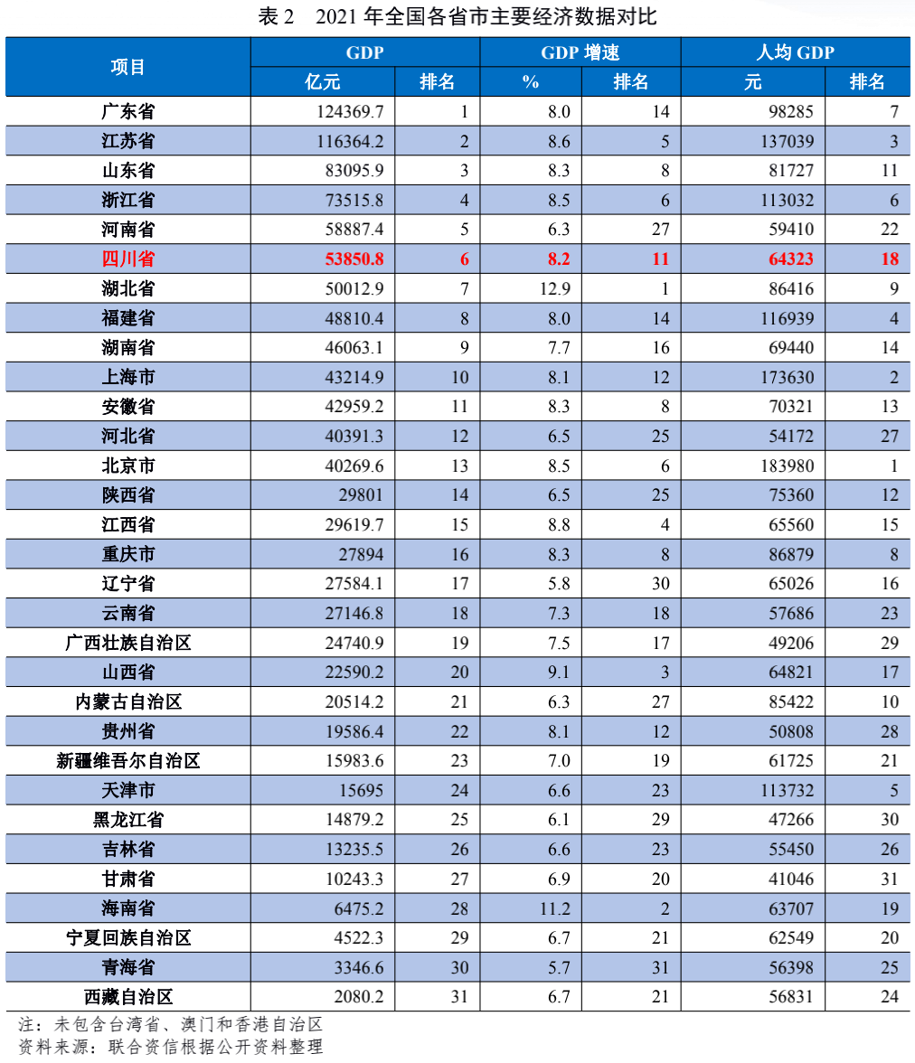 四川省位于中国西南,能源资源丰富,交通网络日趋完善,经济规模位于全国前列,人均GDP处于全国中游水平。2021年,四川省经济增速较上年明显回升,固定资产投资增速较高,持续高于全国水平,是拉动经济发展的重要动力。成渝双城经济圈战略地位重要,交通和产业建设先行,投资进展迅速,未来四川省经济实力有望进一步增强。