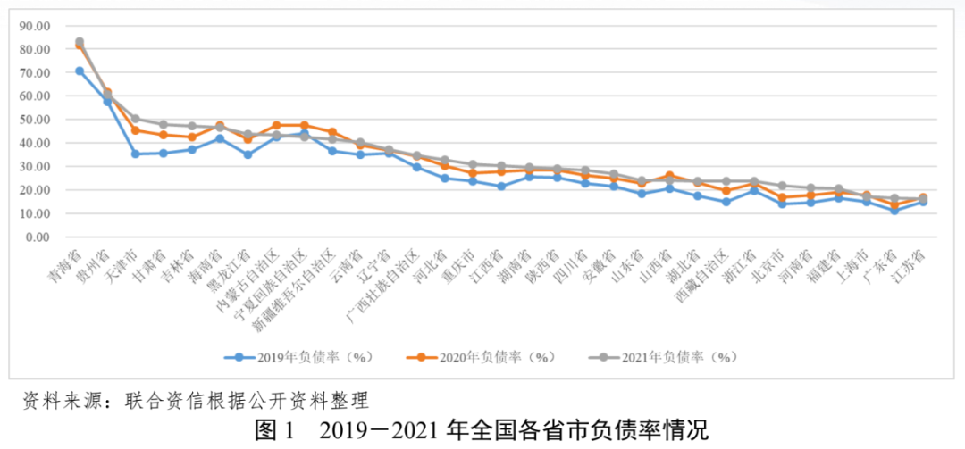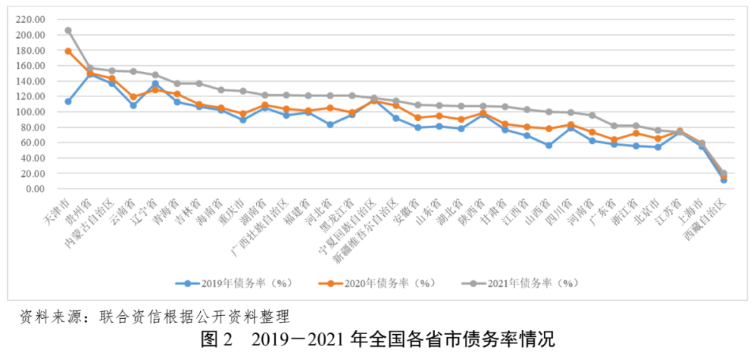 从各地市(州)债务负担来看,2021年,成都市和巴中市“发债城投企业全部债务+地方政府债务”/GDP大于1,债务负担重;眉山市、资阳市、广元市、泸州市和遂宁市比值超65%;其他各地市(州)债务负担相对较轻。
