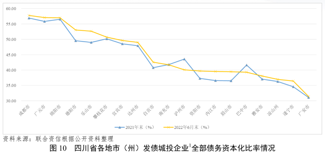 ●四川省发债城投企业数量较多,集中于成都市,区县级发债城投企业占比较高,信用水平分化明显。各地市(州)发债城投企业整体债务负担呈上升趋势,2021年净融资规模有所收窄。截至2022年6月末,成都市、广元市和绵阳市发债城投企业债务负担相对较重,南充市、遂宁市和巴中市发债城投企业短期偿债压力较大。