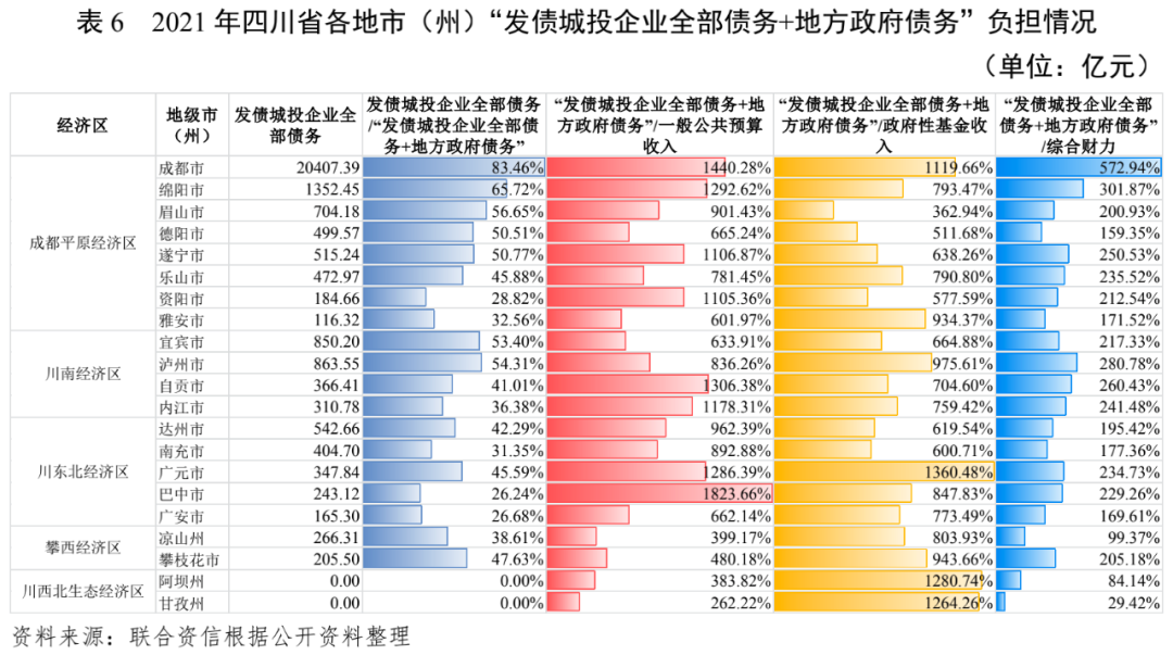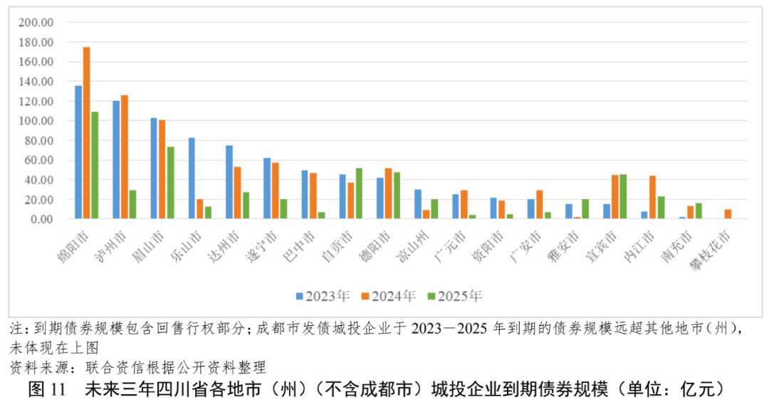 成都市、绵阳市和泸州市地方综合财力对“发债城投企业全部债务和地方政府债务”以及发债城投企业2023年到期债券的支持保障能力相对较低。