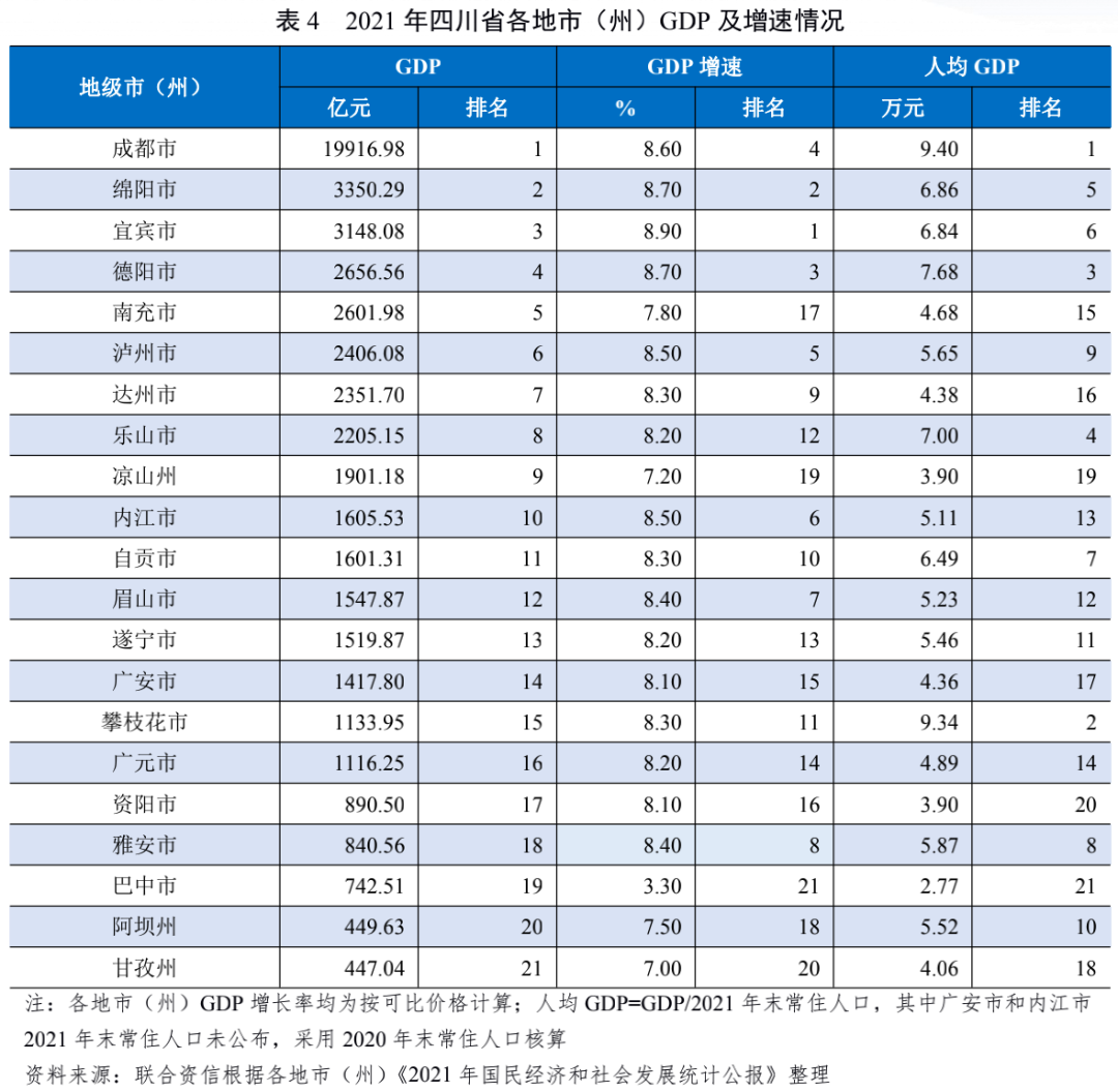 四川省各地市(州)经济发展不均衡。成都平原经济区和川南经济区产业基础较好。成都市作为省会及副省级市,经济实力远强于其他地市(州)。2021年,成都市、宜宾市和绵阳市经济增速较快且人口增长率较高。