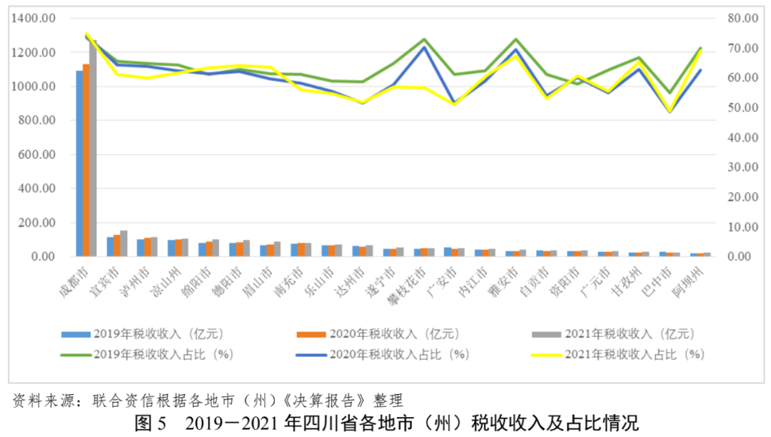 从一般公共预算收入结构来看,成都市税收收入占比超过70%,巴中市税收收入占比最低,仅为48.94%。四川省各地市(州)税收收入在一般预算收入中的占比有升有降。其中,攀枝花市税收收入占比降幅最大,下降13.59个百分点,系非税收入中的国有资源(资产)有偿使用收入大幅增长所致;阿坝州税收收入占比增幅最大,上升6.37个百分点。