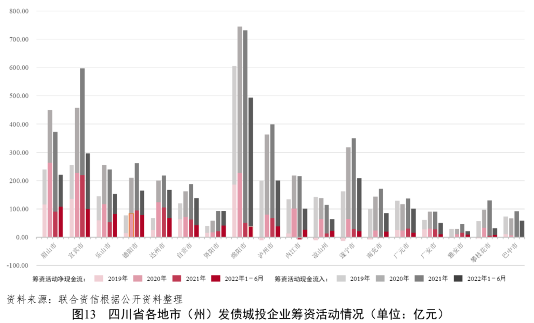 从筹资活动现金流来看,2019-2021年,四川省各地市(州)发债城投企业筹资活动现金流入规模整体呈增长态势。2020年,四川省各地市(州)发债城投企业筹资活动现金流均为净流入状态。2021年,由于还本付息规模扩大,四川省各地市(州)发债城投企业筹资活动净现金流规模整体有所缩减;内江市和南充市发债城投企业筹资活动现金流由净流入转为净流出。2022年1-6月,四川省各地市(州)发债城投企业筹资活动净现金流均呈净流入状态。