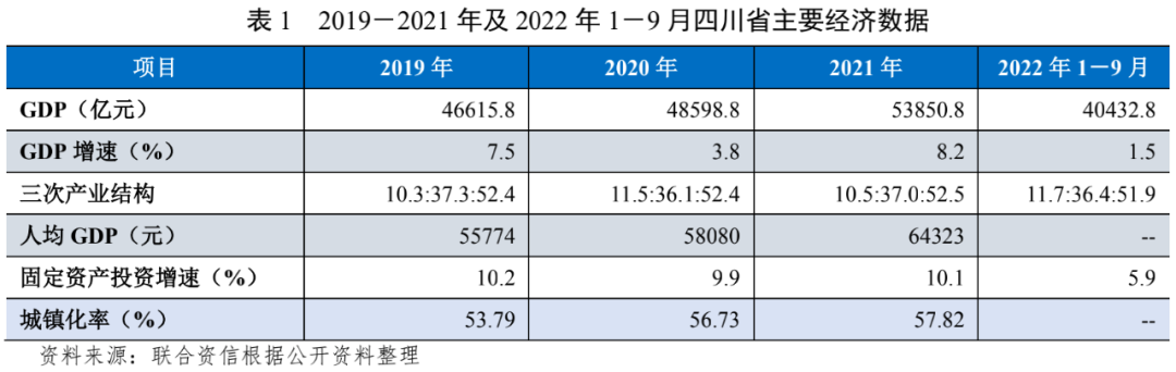 从经济运行方面看,2021年四川省GDP规模位居全国各省市第6位、西部地区第1位,处于全国前列。2019-2021年,四川省地区生产总值增速分别为7.5%、3.8%和8.2%,增速明显回升。截至2021年末,四川省常住人口8372万人,为全国第5名。2019-2021年,四川省城镇化率逐步提高,2021年城镇化率达到57.82%,低于全国水平(64.72%)6.90个百分点。2019-2021年,四川省人均GDP逐年提升,2021年四川省人均GDP在全国排第18名,处于中游水平。2019-2021年,四川省固定资产投资增速持续高于全国水平,2021年增速为10.1%,较全国水平高出5.2个百分点,是拉动经济发展的重要动力。四川省重点发展五大支柱产业,构建了电子信息、装备制造、食品饮料、先进材料、能源化工和数字经济“5+1”产业体系。2021年,三次产业结构由上年的11.5:36.1:52.4调整为10.5:37.0:52.5,产业结构更趋优化。四川省全年工业增加值15428.2亿元,比上年增长9.5%,增速较上年提升5.6个百分点,工业增加值对当年经济增长的贡献率为32.3%。