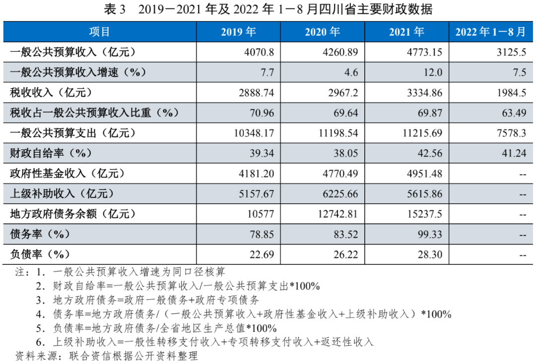 2022年1-6月,四川省一般公共预算收入2479.43亿元,同口径增长9.6%;政府性基金收入1625.78亿元,较上年同期增长22.26%。2022年1-8月,四川省完成一般公共预算收入3125.5亿元,同口径增长7.5%,财政自给率较上年变化不大。