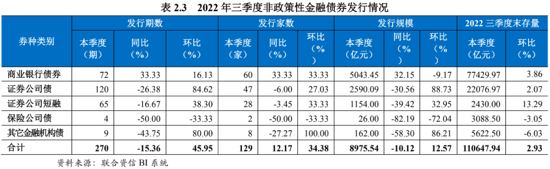 本季度,共有129家金融机构发行非政策性金融债270期[1],总发行规模为8975.54亿元,非政策性金融债发行期数、家数和规模环比均有所增长,发行期数和发行规模同比均有所下降。其中,商业银行债(含商业银行金融债、商业银行其他一级资本工具[2]、商业银行二级资本工具)发行期数、家数和规模同比有所增长,主要由于银行资本补充需求提升,商业银行二级资本债发行力度加大。证券公司债发行量环比增幅显著,主要受三季度融资成本下行,券商发债提速;保险公司债发行期数、家数和规模环比和同比均有较大降幅,可能受本季度保险公司融资需求减弱影响。截至2022年三季度末,非政策性金融债券存量为11.06万亿元,环比增长2.93%。