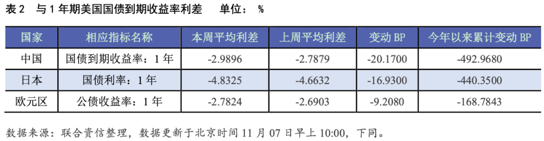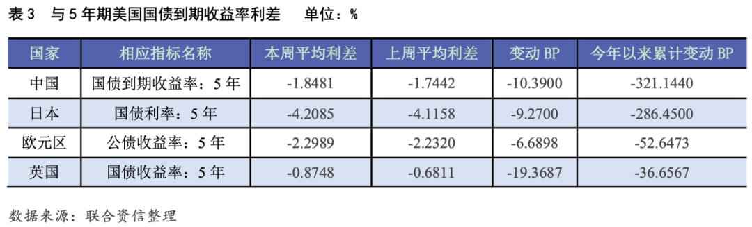 本周1年期、5年期和10年期中美国债平均收益率利差较上周全线走扩20.17个、10.39个和6.89个BP至-2.99%、-1.85%和-1.44%。本周1年期、5年期和10年期日美国债平均收益率利差较上周全线走扩16.93个、9.27个和3.83个BP至-4.83%、-4.21%和-3.85%。本周1年期、5年期和10年期欧元区公债与相应期限美债平均收益率利差分别较上周走扩9.21个、6.69个和2.58个BP至-2.78%、-2.30%和-1.84%。本周5年期和10年期英美债平均收益率利差较上周走扩19.37个和11.49个BP至-0.87%和-0.47%。
