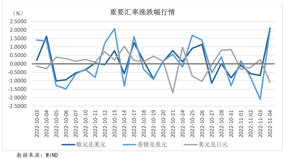 本周,美联储继续保持强势加息,在美联储公布声明之后,主席鲍威尔表示,考虑暂停加息“远远为时过早”,带动美元指数在本周一路攀升至周四。但在周五,美国劳工部公布非农就业数据,虽然美国10月新增就业岗位多于预期,但失业率小幅上升且市场参与度小幅下降,闪现出美国劳动力市场存在一定放缓迹象,市场认为劳动力数据出现疲软信号或使得美联储加息进程有所趋缓,因此导致美元指数在日内大幅下跌近2%,创2015年11月以来最大单日百分比跌幅。截至本周五,美元指数收于110.7839,周内累计小幅收涨0.10%。
