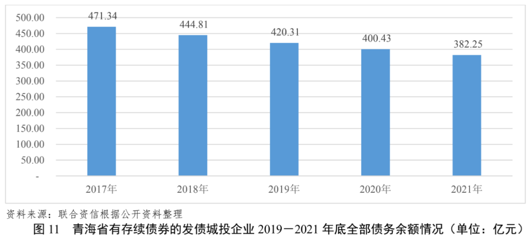 2020年,青海省省属国有企业相继出现信用风险事件,青海省企业融资环境和再融资能力受到一定负面影响。同时,随着部分城投企业债务到期兑付,2017-2021年,青海省发债城投企业全部债务余额逐年下降,截至2021年底为382.25亿元,全部集中在西宁市,青海省发债城投债务集中在省会城市,其余城市除海西州曾存在过2家发债城投企业之外,其余城市均无发债城投企业。