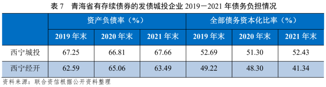 从发债城投企业债务负担来看,2019-2021年,西宁城投的资产负债率和全部债务资本化比率基本保持稳定,西宁经开的全部债务资本化比率[3]逐渐下降,资产负债率波动增长。青海省发债城投企业的债务负担整体小幅下降。