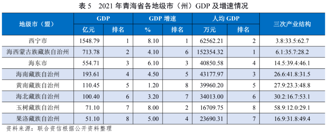 经济实力方面,西宁市、海西州和海东市经济实力较强,位列全省前三名。从GDP规模来看,省会西宁市经济实力远超其他州市,2021年西宁市GDP总量1548.79亿元,占全省GDP总量的46.32%,头部集聚效应明显;其他五个州市中,海南州、黄南州和海北州2021年GDP规模过百亿。从GDP增速来看,2021年,除西宁市和玉树州外,其他州市GDP增速均未达到6.50%,除海北州和黄南州外的其余各州市GDP增速介于4.00%~6.50%。