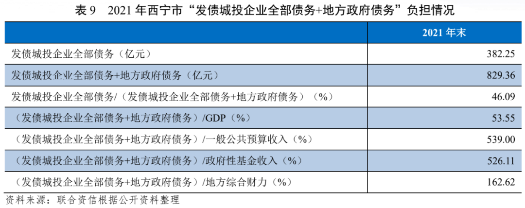 由于青海省有存续债的城投企业目前仅为西宁市2家,本文仅采用西宁市财政收入数据及相关城投数据进行分析。截至2021年底,西宁市“发债城投企业全部债务+地方政府债务”规模829.36亿元,其中发债城投企业全部债务382.25亿元,占地区不完全统计债务比重为46.09%,占比较高。