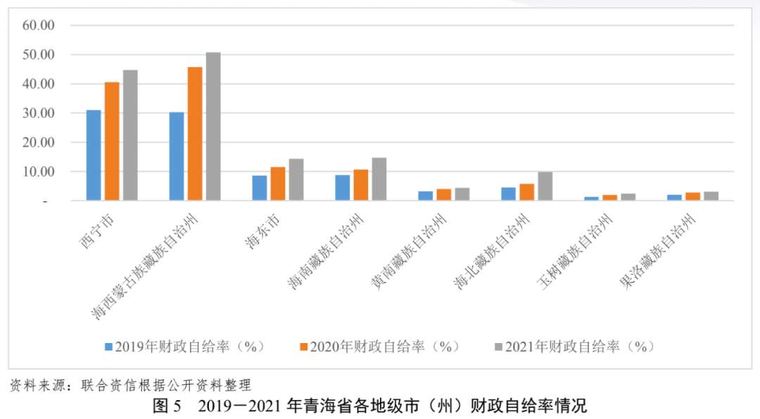 财政自给率方面,2019-2021年西宁市和海西州财政自给率超过30.00%,2021年分别为44.76%和50.77%;其他州市2019-2021年财政自给率均未超过15.00%,其中海东市和海南州财政自给率不断上升。总体看,青海省各州市财政自给能力弱,对上级补助收入的依赖性强。