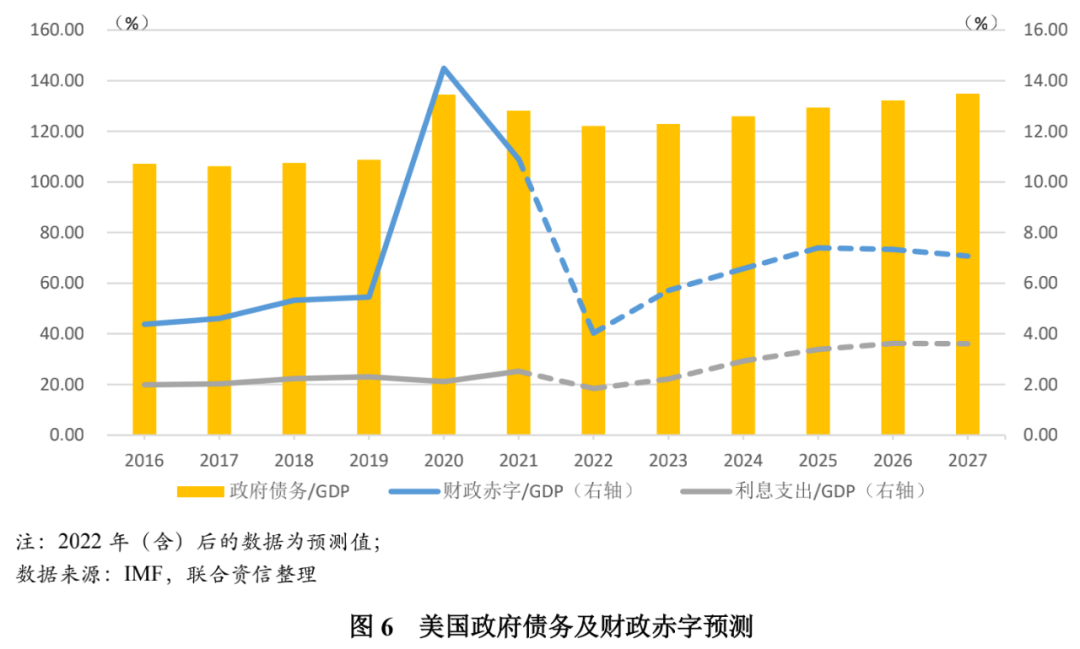 一是体现在政府债务水平处于历史峰值。根据IMF预测数据显示,美国政府债务规模呈现不断上升的趋势,2022年政府债务总额攀升至30.6万亿美元,且未来5年政府债务可能会进一步攀升至41万亿美元。政府债务与GDP的比值在2020年一度超过130%,后随着GDP增长而回落,但预计未来5年将进一步攀升至135%。考虑到美国本轮经济收紧经济周期有望在2023年或2024年结束,届时美国将迎来新一轮宽松周期,政府债务水平可能会步入新的快速攀升期。