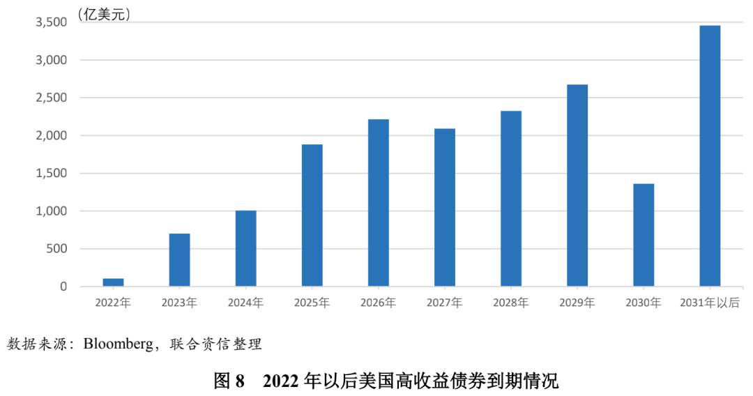 从债券到期情况看,债券到期意味着企业需要大量现金来支付债务的本金和利息,如果企业的流动性不足,需要借助再融资偿还债务,若信贷环境恶化,可能造成资不抵债的再融资风险。2022年以后美国高收益债券到期压力增大,2023年和2024年的到期规模分别高达700亿美元和1,007亿美元。
