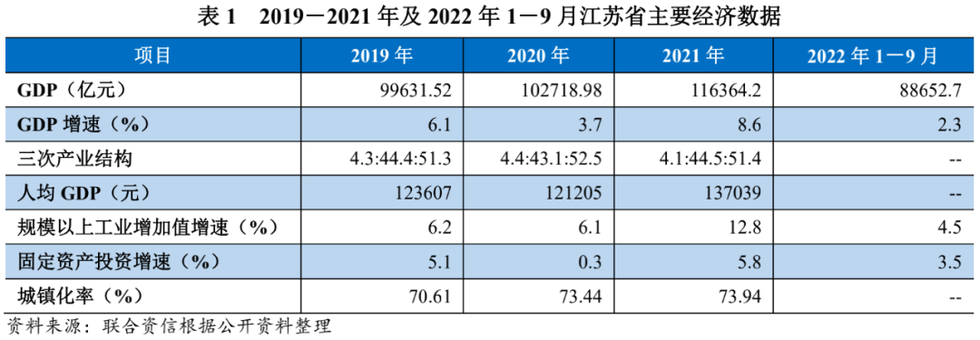 江苏省地理位置优越,自然资源丰富,交通体系完善;人口基数大,且保持净增长。2021年,江苏省经济总量稳居全国第二位,人均GDP处于全国省域首位;2021年固定资产投资增速提升明显,产业结构持续优化,工业体系完备;上市企业数量众多,经济发展潜力强。2021年,江苏省一般公共预算收入增速及财政自给率均有所上升,一般公共预算收入规模仍稳居全国第二位,且质量较高;同期政府性基金收入增幅较大,对综合财力贡献高,江苏省整体财政实力强;政府债务负担轻。2022年以来,受宏观经济形势变化及多发散发疫情的影响,江苏省经济增速有所放缓,一般公共预算收入增长承压。