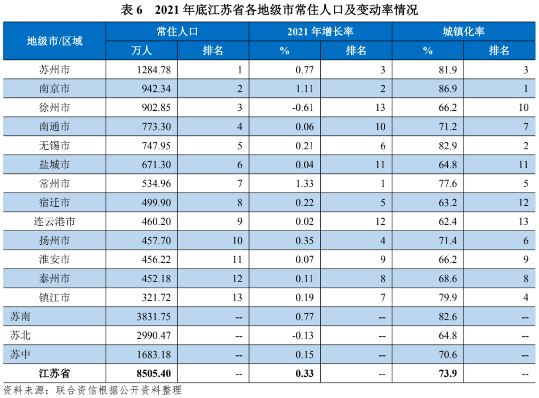 人口和城镇化方面,截至2021年底,江苏省常住人口8505.4万人,比上年末增加28.1万人,增长0.3%,占全国人口的6.02%;年末常住人口城镇化率达73.94%,比上年末提高0.5个百分点。