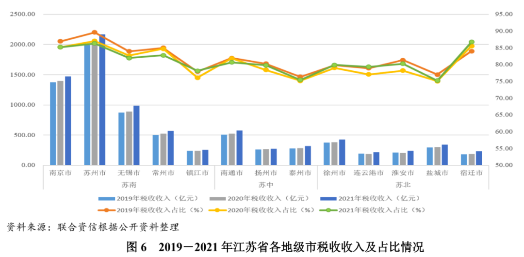 财政方面,江苏省各地级市一般公共预算收入稳定性较强,质量较高;各地级市政府性基金收入规模较大;苏南地区各项财力指标普遍强于苏中和苏北地区,但从增速上看,2021年一般公共预算收入和政府性基金收入增速较高的地级市主要集中在苏北地区。2021年,江苏省各地级市政府债务余额呈上升趋势,南京市政府债务余额规模最大,镇江市政府债务余额增速较快,政府债务负担相比其他地级市较重;苏南地区(除镇江市)政府债务偿还能力明显强于苏中和苏北地区,苏州市、常州市和无锡市政府债务率相对较低,偿债能力较强;镇江市债务率较高,偿债能力偏弱。