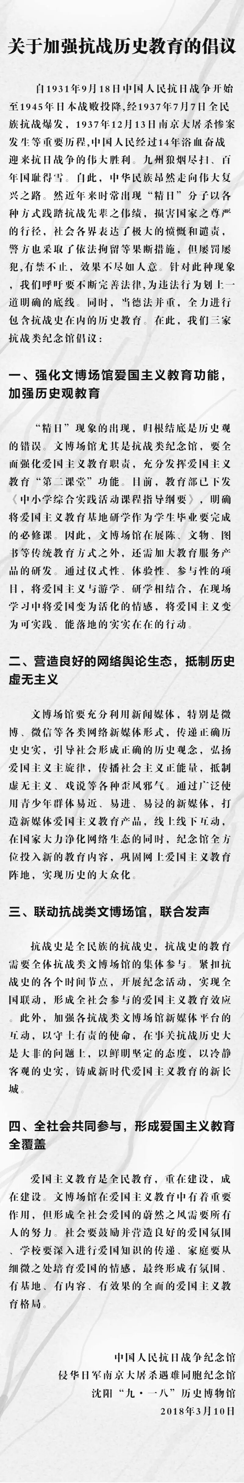 针对一些“精日”分子以各种方式践踏抗战先辈之伟绩,损害国家之尊严的行径,2018年3月10日,中国人民抗日战争纪念馆、侵华日军南京大屠杀遇难同胞纪念馆和沈阳“九·一八”历史博物馆联合发出倡议:要给“精日”分子的违法行为划上一条明确的底线。