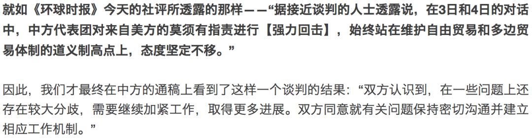 那么,大家在了解了这一情况后,再回过头来看今天中方发布的那份关于谈判的“通稿”,就会发现那看似“波澜不惊”的文字背后,尤其是那句“坦诚、高效、富有建设性的讨论”描述背后,隐藏着多少激烈的碰撞了。