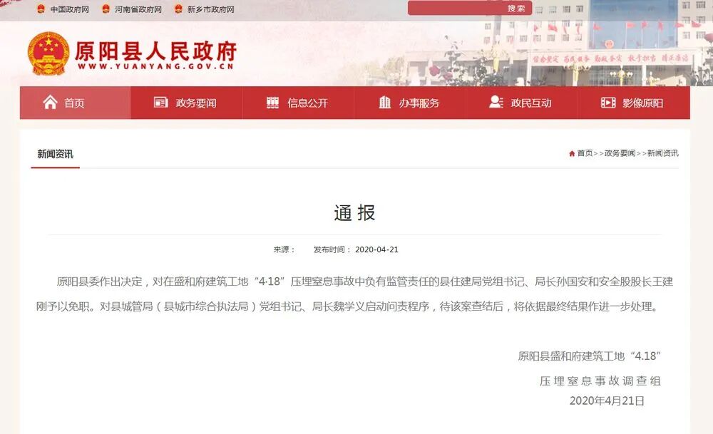 21日,原阳县人民政府网站发布通报:原阳县委作出决定,对在盛和府建筑工地“4·18”压埋窒息事故中负有监管责任的县住建局党组书记、局长孙国安和安全股股长王建刚予以免职。对县城管局(县城市综合执法局)党组书记、局长魏学义启动问责程序,待该案查结后,将依据最终结果作进一步处理。