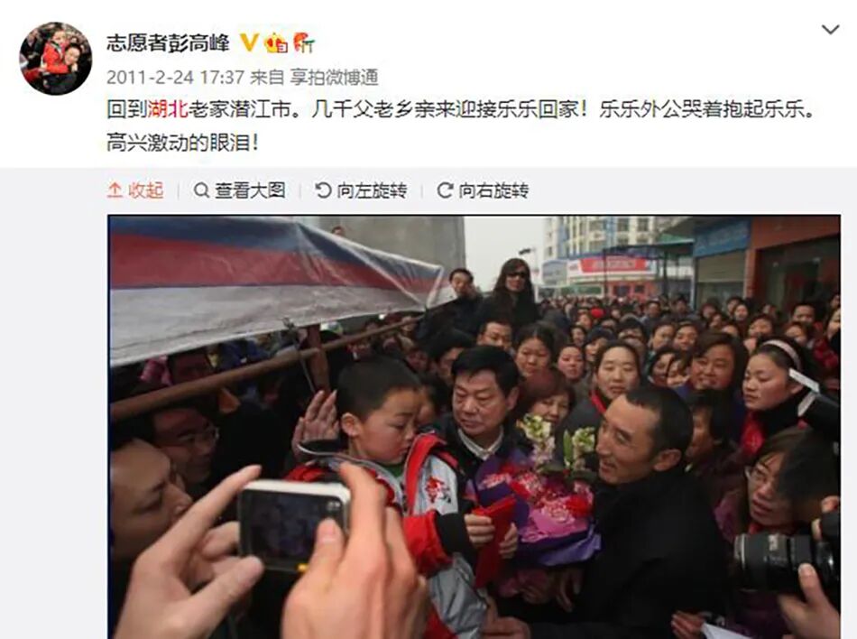 2011年2月14日,彭高峰带乐乐回潜江老家,很多人迎接乐乐回家。