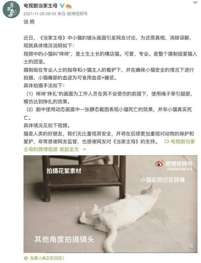 剧组是否真的虐杀了小猫?针对网友关注的这个核心问题,警方调取了剧组的拍摄花絮,从花絮中可以清晰地看到,拍摄时剧组用鱼线拉扯白猫,白猫倒地后有舔舌等动作。可以初步判定,猫咪并没有当场死亡,“剧组虐猫”是谣言。此后,公安机关进一步调查,证实剧组因拍摄致猫死亡等事实不成立。
