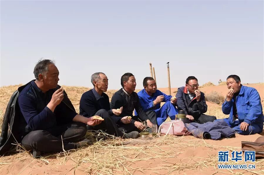 在甘肃省古浪县境内的黑岗沙风沙口,八步沙第二代治沙人贺中强(左一)、郭万刚(左二)、石银山(左三)、罗兴全(右三)、程生学(右二)、王志鹏(右一)在休息间隙吃午饭(3月26日摄)。 新华社记者范培珅 摄