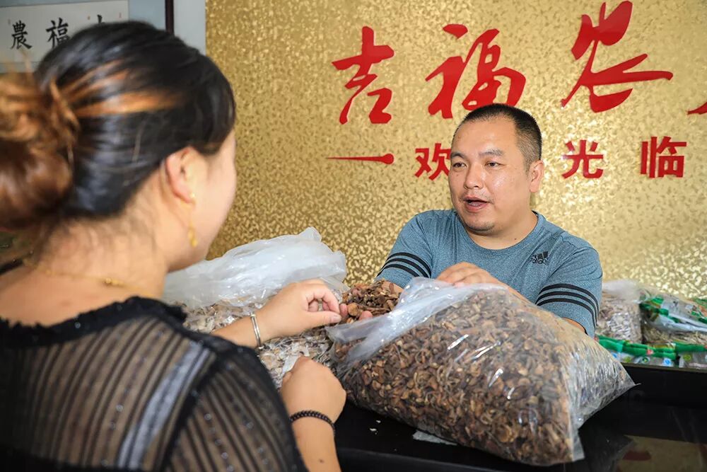 吴良宝在自家农家乐里向游客推荐当地的山货。张俊摄