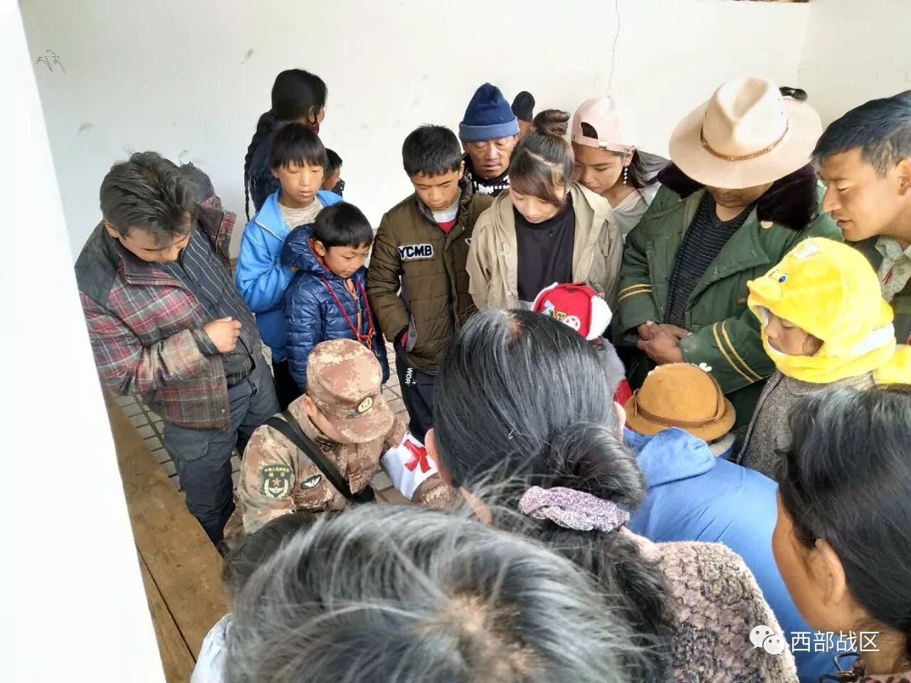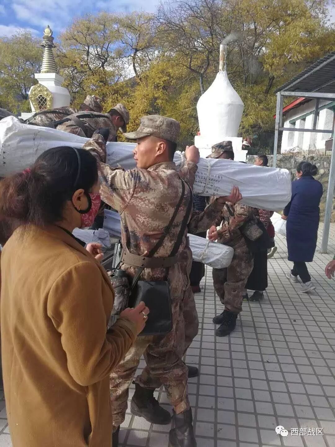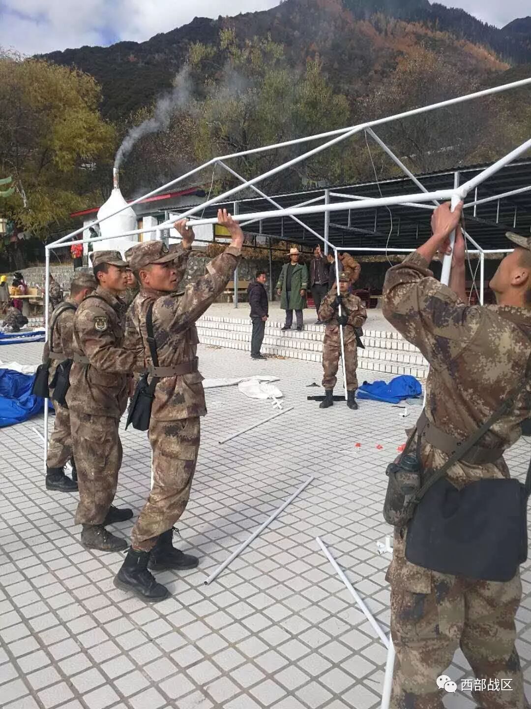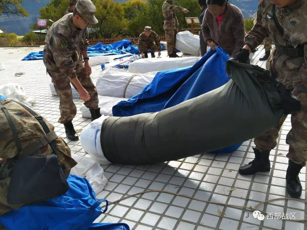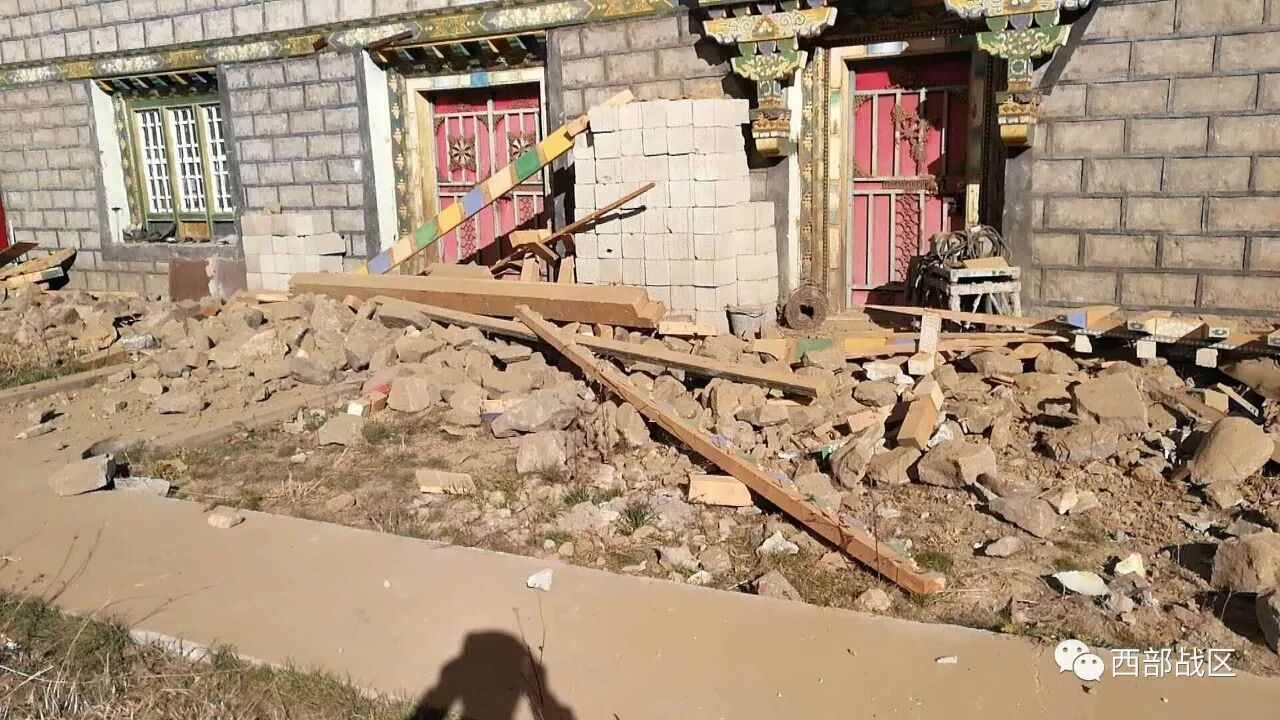 军报记者-西部战区讯(李钦)西藏军区驻米林某边防团抢险救灾分队于10时到达震中地区(林芝市米林县派镇索松村),村庄部分墙体开裂倒塌,村民均集中在民俗广场。官兵正积极帮助村民转移财产、搭建帐篷,为受伤人员进行初步诊治。