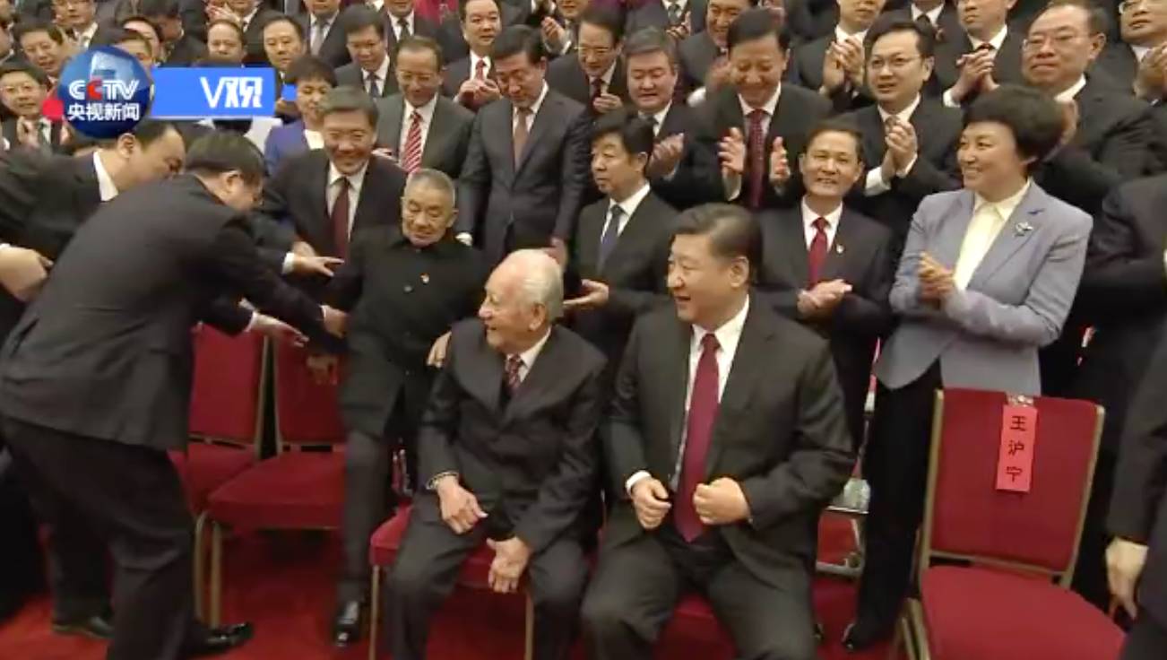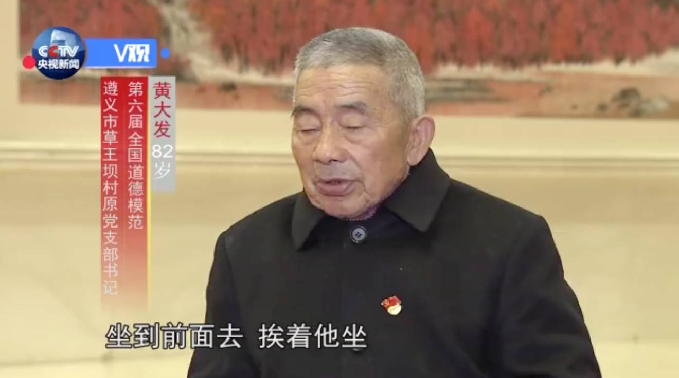 看到93岁的中船重工719研究所名誉所长黄旭华、82岁的贵州省遵义市播州区平正仡佬族乡草王坝村原党支部书记黄大发两位全国道德模范代表年事已高,站在代表们中间,习近平握住他们的手,请他们坐到自己身旁。两人执意推辞,总书记一再邀请,最后两人在总书记身边坐下。