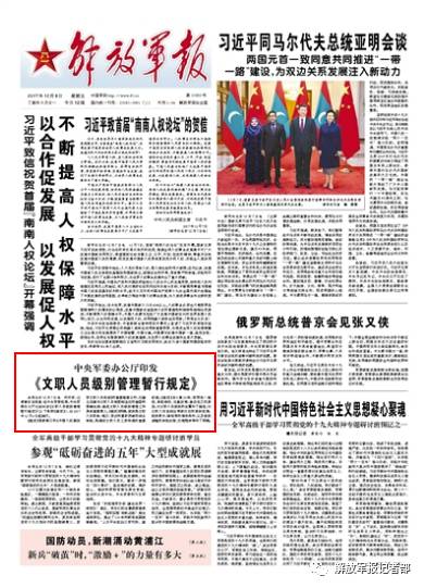 经中央军委批准,中央军委办公厅日前印发《文职人员级别管理暂行规定》(以下简称《规定》),自2017年12月6日起施行。请关注今日出版的《解放军报》的文章——