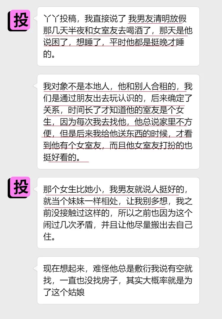 回归正题,今天的投稿人是位女生,她觉得男友和合租的女室友关系有点不正常,问问丫丫是不是自己已经被绿了。
