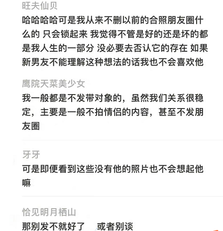 我发现好几对情侣的朋友圈,都是差不多的照片发两次。问说是因为这样即使分手了只用删掉合照就好,自己的美照不会受影响。感觉很理智!和我喜欢就唰唰发,分手了就通通删的做法不一样。有人觉得要删,阶段性陪伴等于没有陪伴,是无用的经历。有人把每一段都视作可以大方展示给下一任的必经路。有个朋友圈一开到底的男生,对常年三天可见的我说过,人能去到的地方很多,但是能回去的地方就太少了。所以好多东西他都留着。