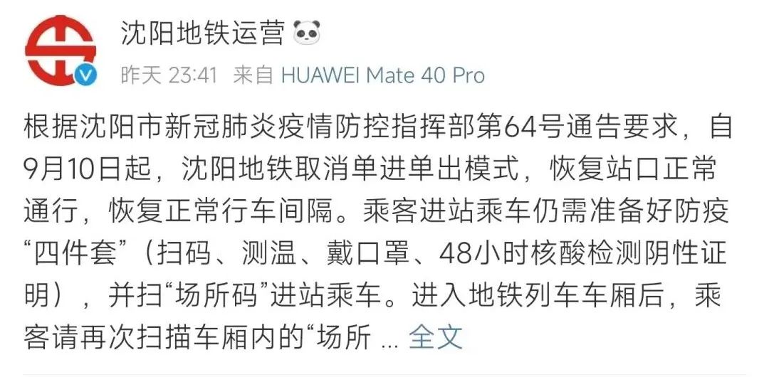 根据沈阳市新冠肺炎疫情防控指挥部第64号通告要求,自9月10日起,沈阳地铁取消单进单出模式,恢复站口正常通行,恢复正常行车间隔。