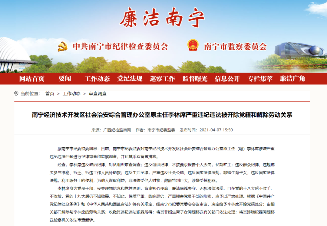 4月8日,记者从市纪委监委了解到,日前,南宁市纪委监委对南宁经济技术开发区社会治安综合管理办公室原主任(聘)李林席涉嫌严重违纪违法问题进行纪律审查和监察调查,并对其采取留置措施。