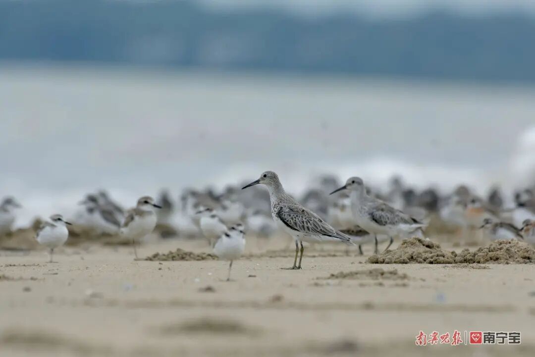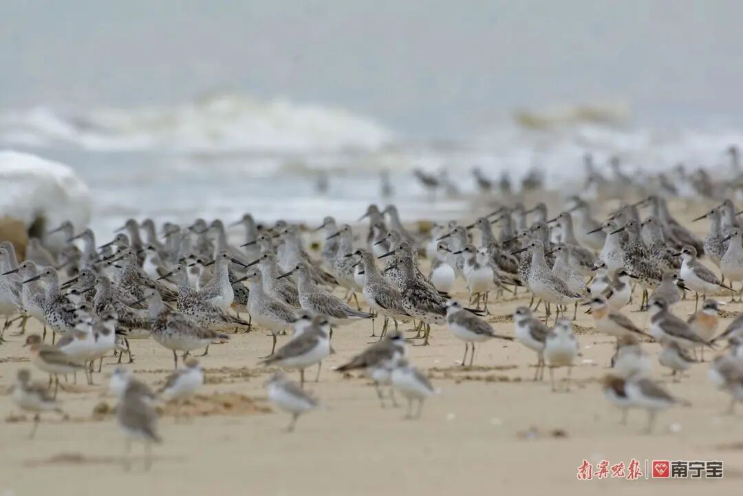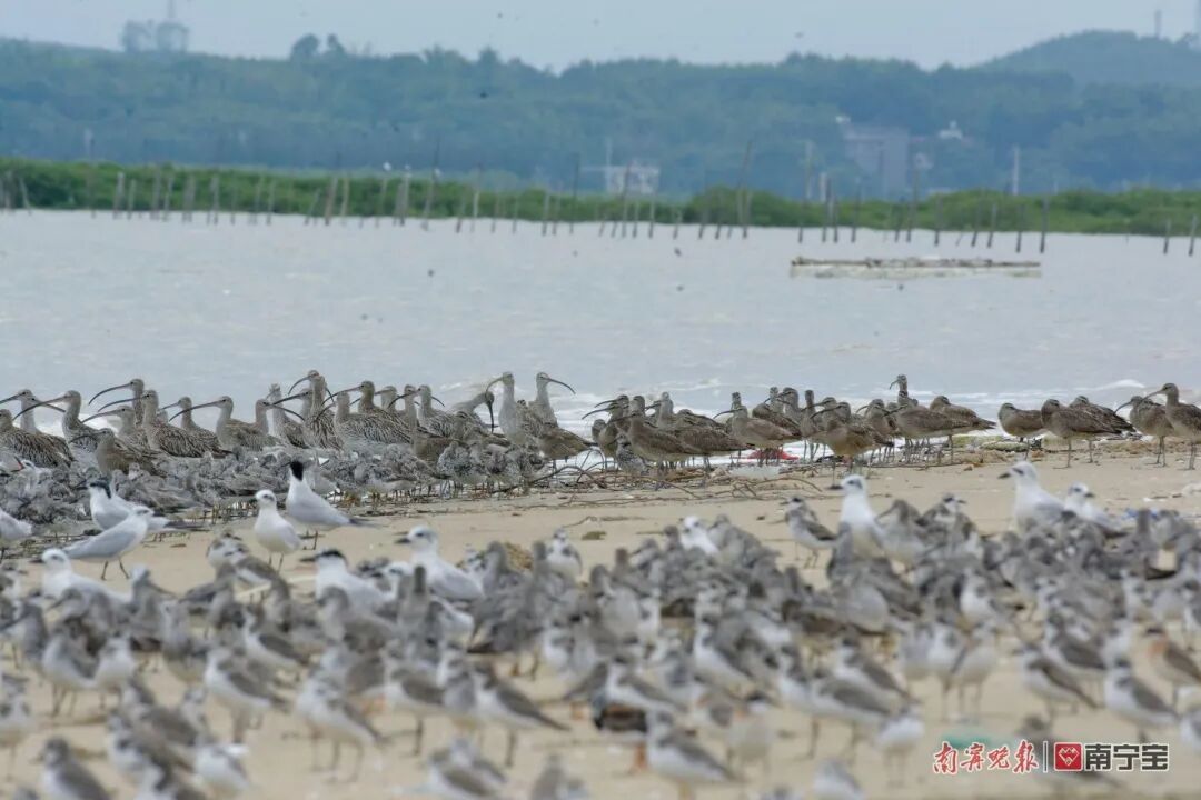 在钦州三娘湾连续蹲守几天后,知名拍鸟爱好者“吃不下饭”惊喜地发现,在退潮后的滩涂上,1000多只水鸟驻足、觅食,其中,不乏有“洁癖”的大滨鹬、白腰杓鹬、中杓鹬、鸥嘴噪鸥等国家二级保护动物。