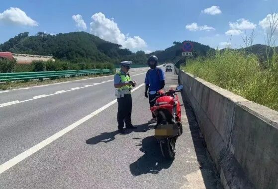 经询问,摩托车驾驶人莫某某是从苍梧县岭脚镇出发,前往广东肇庆市,自以为走高速公路更便捷,交警应该不会发现,哪知刚上来就被逮个正着。