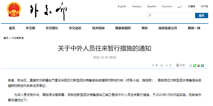 12月27日,国务院应对新型冠状病毒感染疫情联防联控机制外事组发布《关于中外人员往来暂行措施的通知》。《通知》全文如下: