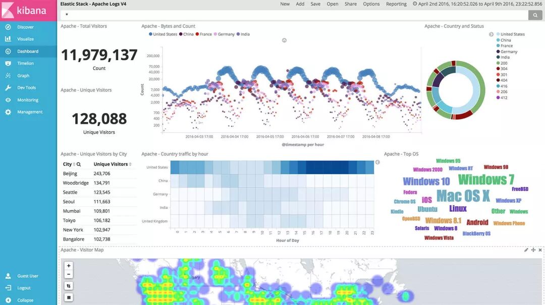 下图是一个Elastic的搜索在Kibana中看到的例子,原始的数据是一个简单的日志文件: