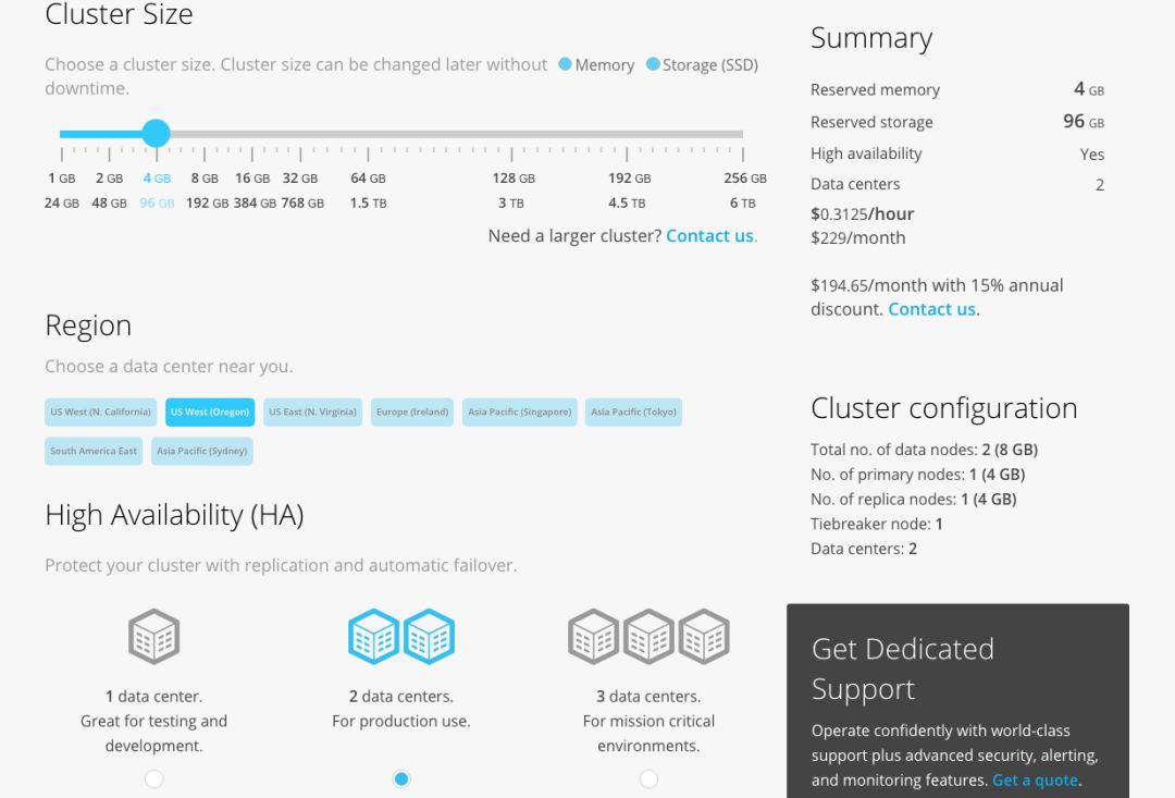 云服务的价格参考下图,ES的云是按照所使用的资源来收费,从这里选取的区域可以看出,ES的云也是运行在AWS上的。下图中的配置每月需要花费200美元左右。(不同区域的收费不同)