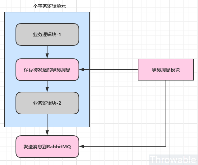@Transactionalpublic Dto businessMethod(){business transaction code block ...// 保存事务消息[]// 注册事务同步器 - 在afterCommit()方法中推送消息到RabbitMQ[]business transaction code block ...}