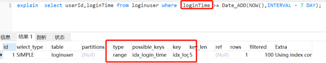 explain select userId,loginTime from loginuser where loginTime >= Date_ADD(NOW(),INTERVAL - 7 DAY);理由: