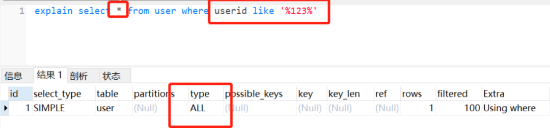 -- like模糊查询,不走索引了select * from user where userid like '%123%'