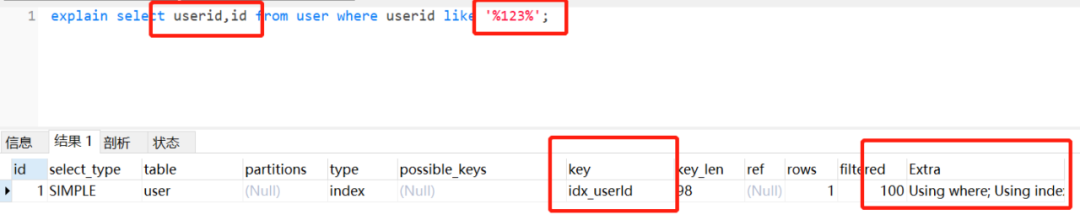 -- id 为主键,那么为普通索引,即覆盖索引登场了select id,name from user where userid like '%123%';