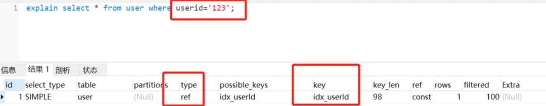 select * from user where userid ='123';理由:为什么第一条语句未加单引号就不走索引了呢? 这是因为不加单引号时,是字符串跟数字的比较。由于它们类型不匹配,MySQL 会做隐式的类型转换,把它们转换为浮点数再做比较。