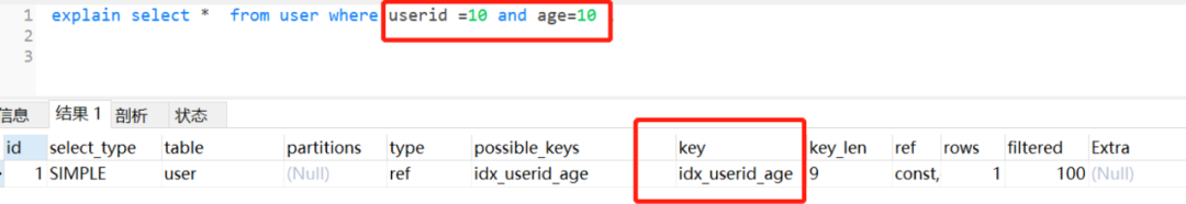 -- 符合最左匹配原则select * from user where userid=10 and age =10;-- 符合最左匹配原则select * from user where userid =10;