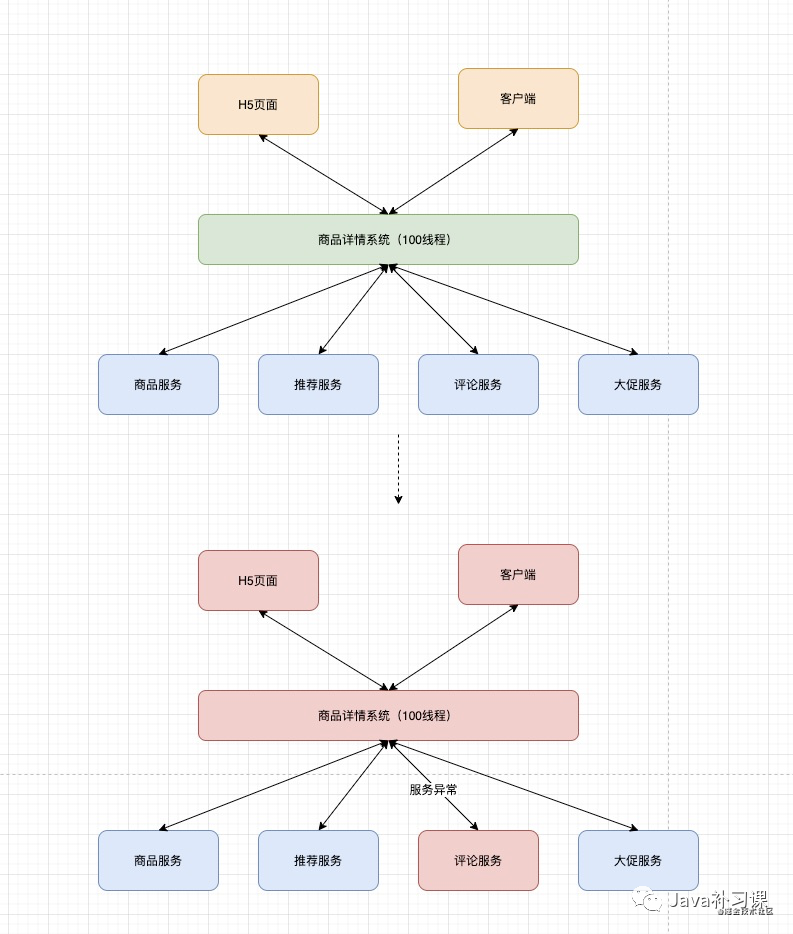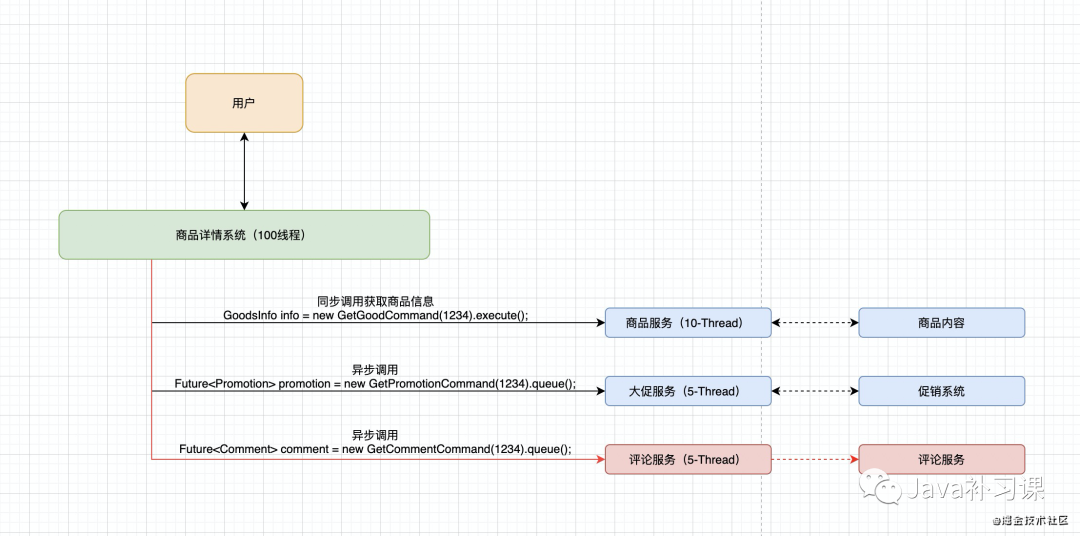 在服务调用时,分配独立的线程池进行资源隔离调用。如下图中的评论服务出现不可用时,商品详情系统还是能够将商品信息,大促信息封装好返回给用户。评论服务的异常并不会影响其他依赖的调用。