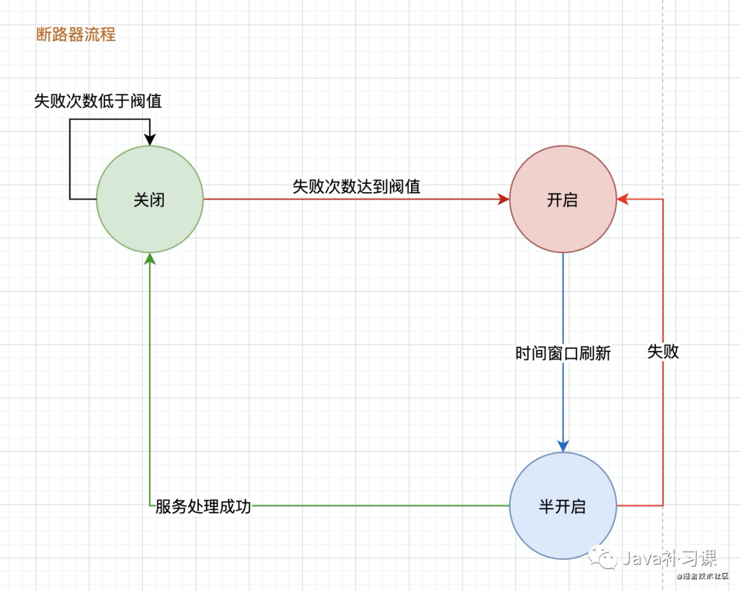 当单位统计时长内请求数目大于设置的最小请求数目,并且异常的比例大于阈值则接下来的熔断时长内请求会自动被熔断。