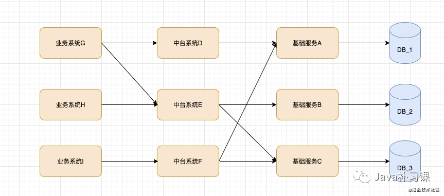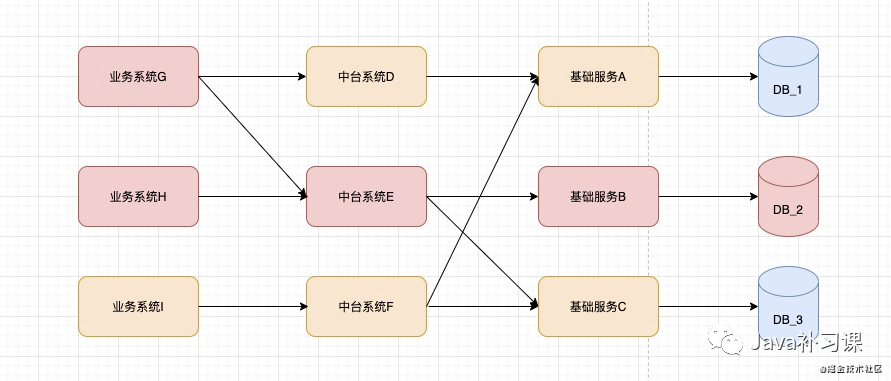 如果在大促期间, DB_2 由于机器负载过高可能出现 SQL 执行缓慢、链接数打满或网络抖动等情况导致 DB_2 不可用。那么,整体链路的影响就会变成: